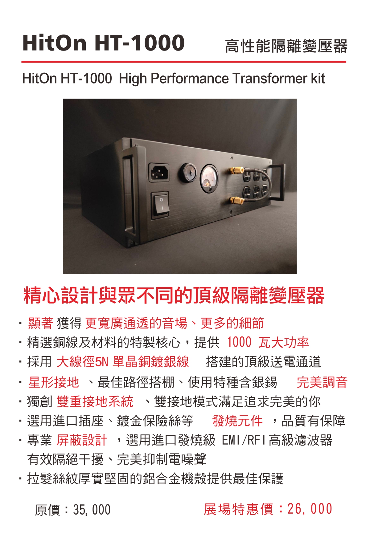 專題報導連結: http://www.hitonaudio.com/forum_oneissue.php?category=diy&mi=3990 HT-1000隔離變壓器生產完畢! 第一批HT-1000已經生產完畢,價格理應回到三字頭,站長與廠商爭取之後,目前緩衝期價格暫為28,000元,這個價格站長HOLD不久,請還沒訂購的朋友們把握機會~>< 這台一接上去你家系統的聲音馬上就會有明顯的進步,想借聽體驗的人可以聯絡站長!^^